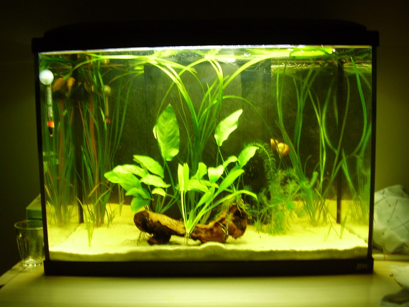 Είμαι μέλος του goldfish.gr και από εκεί έμαθα τα πάντα για τα χρυσοψαράκια. Είχα και εγώ μερικές απώλειες ψαριών αλλά δεν το έβαλα κάτω. Είμαι αρχάρια γιατί το ενυδρείο μου λειτουργεί από της 8/1/2007. Έχω ακόμα πολλά να μάθω και γι'αυτό έγινα μέλος εδώ στο GAB. Την ρίζα ξύλου που έχω βάλει είναι καινούρια οπότε τα φυτά δεν έχουν δέσει ακόμα επάνω. Την πρώτη anubia που αγόρασα την χώρισα στα δύο και έβαλα αριστερά και δεξιά στην ρίζα ξύλου. Αν υπάρχει κάποια παρατήρηση ή κάποια πρόταση θα ήθελα να μου πείτε. Επίσης την καμπανούλα που είχα την έβγαλα.