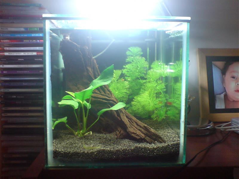 Το ενυδρειακι ειναι 25-25-25 (καθαρο νερο 11λιτρα) και η θεση του ειναι στην γωνια του γραφειου μου.....το ph ειναι 7, ecxel καθημερινα 0,3ml,και θερμοκρασια 27c, τα φυτα:μια ανουμπια,σεσιφλορα και απο φωτισμο μια λαμπα 11w στα 6400 kelvin.O κατοικος του ονομαζεται Πατροκλος..... ΥΓ. Απο την δευτερη μερα που τον εβαλα στο καινουργιο του σπιτι ,μου εφτειαξε φωλια......