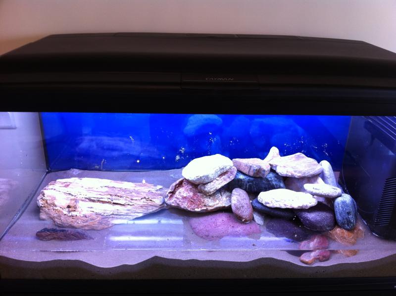 Έχω ακριβώς το ίδιο ενυδρείο και μέχρι πριν λίγες μέρες φιλοξενούσα κιχλίδες malawi (labido + maingano) και είχα πέτρες μέχρι πολύ ψηλά. Είναι το καλύτερο που μπορείς να κάνεις γι'αυτά τα ψαράκια μαζί με το "¨σκληρό" νερό.
