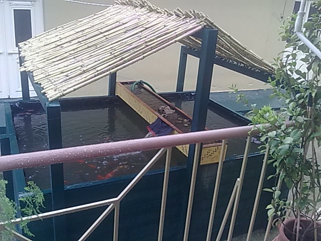 απο φυτα εβαλα μονο 6 μεγαλες γλαστρες νουφαρα και μια ποτεδερια αν τη λεω σωστα εχει περιπου 30 χρυσοψαρα και 6 κοι.