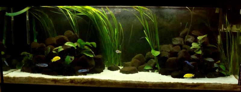 Διαστάσεις: Rio 400 Όγκος: 450 L Κατηγορία: Malawi mbuna Φυτά: Vallisneria, Anubia Ψάρια / ¶λλα είδη:3 Labidochromis species “yellow”, 4 Melanochromis cyaneorhabdos “maingano”, 5 Pseodotropheus Acei Msuli “yellow tail”, 3 Pseudotropheus Acei Ngara “ white tail” και 2 Pseudotropheus Demasoni τα οποία όταν μπορέσω να τα πιάσω θα φύγουν. Διακοσμητικά υλικά: 50 κιλά λευκή άμμος, 100 κιλά πέτρες Φόντο: Μπλέ σκούρο χαρτόνι Φωτισμός: 3χ36watt Arcadia, 1 Blue Light Διάρκεια φωτισμού: 8ώρες (16:00 – 12:00) και 1 ώρα Blue Light (12:00 – 01:00) Φιλτράρισμα: Eheim 2229 wet-dry 1050l/h, Sacem Marathon 1000l/h, Κυκλοφορητής Juwel 1000l/h Θερμοστάτης: 300W Λίπανση:όχι Παροχή CO2:όχι Παράμετροι: pH: 8,2 Γενική σκληρότητα (GH): 15 Ανθρακική σκληρότητα (ΚΗ): 12 Αμμωνία (ΝΗ3): 0 Νιτρώδη (ΝΟ2): 0 Νιτρικά (ΝΟ3): 10 Αλλαγές νερού: 30% κάθε βδομάδα Θερμοκρασία: 26,5 ¶λλες πληροφορίες: Το ενυδρείο δουλεύει 8 μήνες. Όλα τα σχόλια καλοδεχούμενα Φωτογραφία: