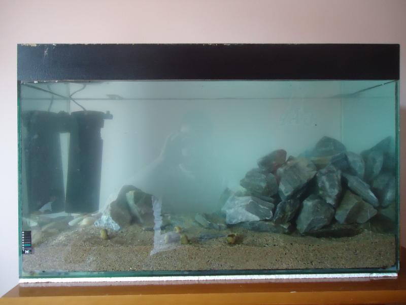 το νερο αρκετα καθαρο. μπηκε φοντο αν και εχει γρατσουνιες με το κιλο. και τα 1α ψαρακια pseudotropheus demasoni! μεχρι τελος της εβδομαδος θα μπουν και ενα χαρεμι labidochromes |