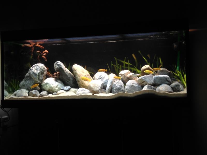 Διαστάσεις:151x51x66 (Rio 400) Όγκος:450l Κατηγορία:Malawi Φυτά:Valisneria gigantea , Java moss Ψάρια / ¶λλα είδη:4 Labidochromis caeruleus , 4 Metriaclima estherae "red zebra" , 1 ζευγάρι Melanochromis auratus , 1 Pseudotropheus socolofi , 6 Pseudotropheus sp."Acei , 2 neritina natalensis snail Διακοσμητικά υλικά: Πέτρες , 3 ρίζες driftwood , ¶μμο θαλάσσης Φόντο :Μαύρη μεμβράνη Φωτισμός: Τ8 2χ36w 1 6500k Μπροστά , 1 3500k πίσω Διάρκεια φωτισμού:8 ώρες Φιλτράρισμα: Eheim 2217 (1000lt),eheim ecco pro 2236(750lt),Eheim pro II 2036(950lt), εσωτερικό Juwel (Μηχανικό φιλτράρισμα ) (600lt) 2 κυκλοφορητές 6000lt & 3000 lt Θερμοστάτης:150w & 300w, Ιχνοστοιχεία : Seachem Cichlid Lake Salt , Σόδα Παροχή CO2: Όχι Παράμετροι: pH: 8.2 Γενική σκληρότητα (GH):12 Ανθρακική σκληρότητα (ΚΗ):10 Αμμωνία (ΝΗ3):0 Νιτρώδη (ΝΟ2):0 Νιτρικά (ΝΟ3):5 Αλλαγές νερού:35% Κάθε εβδομάδα Θερμοκρασία:23-25 ¶λλες πληροφορίες: φελιζόλ dow Φωτογραφία: