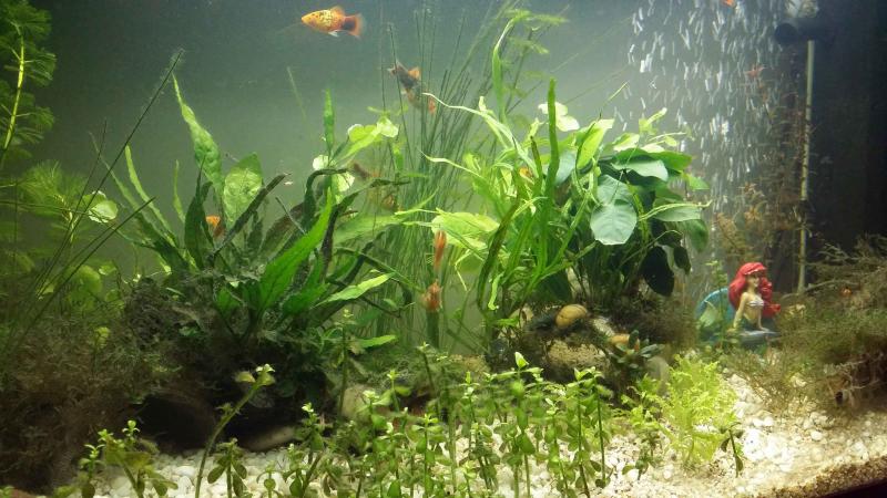 Διαστάσεις: 81x36x45 Λίτρα: 110lt Χρόνος λειτουργίας: 6 μήνες Τύπος και διάρκεια φωτισμού: 2 Τ8 18 watt/ 8 ώρες Co2 και τρόπος διάχυσης: excel 2,5ml/2 ημέρες Λίπανση: ταμπλέτες στις ρίζες και υγρό λίπασμα (all in one/microbe) 5ml 2 φορές τη βδομάδα Υπόστρωμα: Trpica aquarium soil 6lt Φίλτρανση: juwel ecoflow 500lt/h το εργοστασιακό βιολογικό φίλτρο έχει αντικατασταθεί με υαλοβάμβακα και κεραμικό υλικό Θερμοκρασία: 25 C pΗ: 7 NH3: 0 NO2:0 NO3:25mg/lt GΗ:179ppm KΗ:7 dKH Λίστα φυτών: cadomba caroliniana, ludwigia palustris,bacopa compact,microsorum pteropus,microsorum pteropus trident,hydrocotyle leucocephala,bucephalandra Brownie,anubia barteri nana,pogostemon helferi,taxiphyllum spiky Λίστα ψαριών: 1. platy: tuxedo, red coralκαι gold (περίπου 15 με 2 πρόσφατες γέννες - 10 ενήλικα) 2. clown loac x2 3. otocinclus affinis x2 Ρουτίνα αλλαγής νερού: 30%/εβδομάδα με seachem prime ------------------------- Διακοσμητικά: 2 ξύλα και 3 σωλήνες pvc για κρυψώνες. ------------------------- Οποιαδήποτε, πρόταση καλοδεχούμενη. Σηκώνω και μερικές photo. Τελευταία επεξεργασία από το χρήστη johnyl : 09-12-16 στις 18:05. Αιτία: Automerged Doublepost |