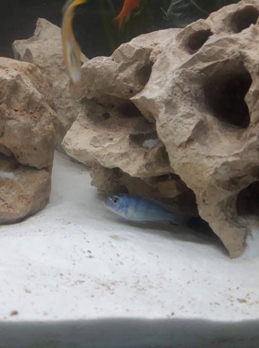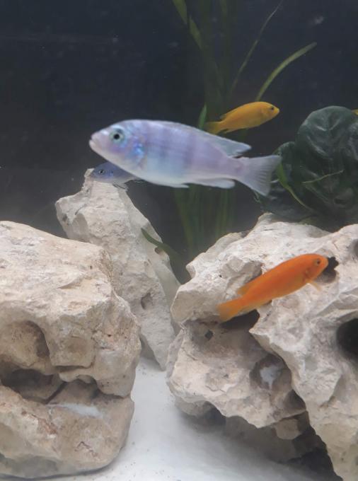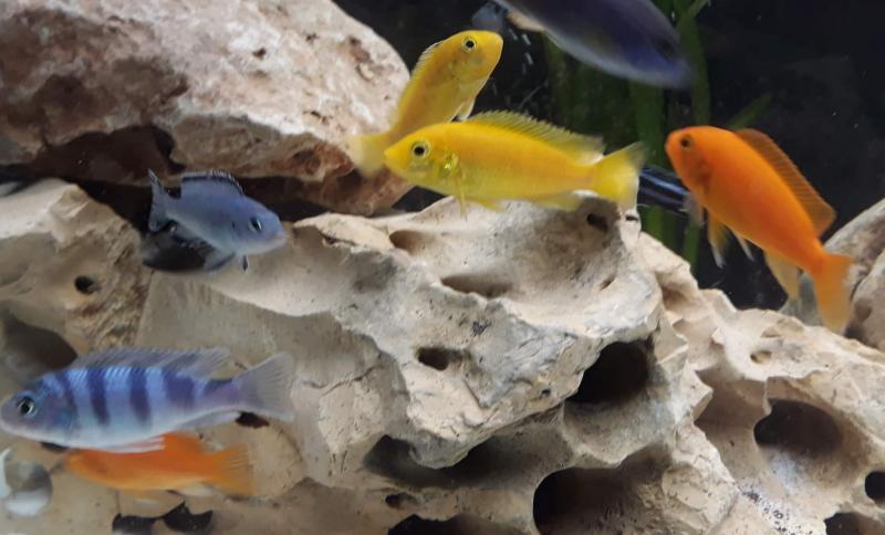 Αυτά με το γαλαζωπό σώμα και την κίτρινη ουρά είναι Pseudotropheus sp. "acei" και είναι καλή επιλογή γιατί είναι σχετικά ήρεμα και κολυμπούν στα ανοιχτά (δεν ξεχωρίζει εύκολα το φύλο και πρέπει να βάλεις 5/6+ ώστε να βγει χαρέμι).