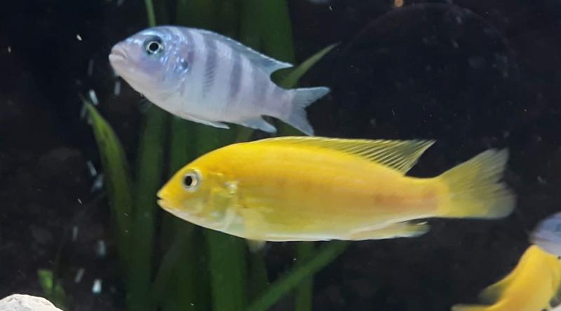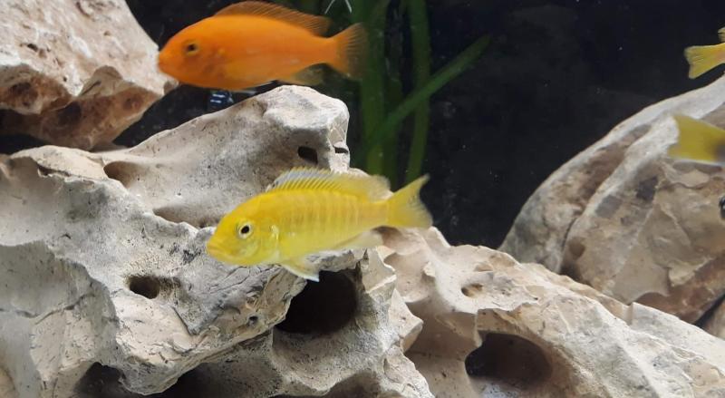 Τα κιτρινόμαυρα με οριζόντιο ριγέ είναι Melanochromis auratus και όταν ενηλικιωθούν θα γίνουν ο εφιάλτης των υπολοίπων.