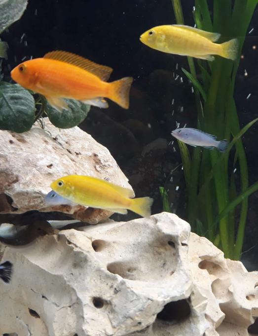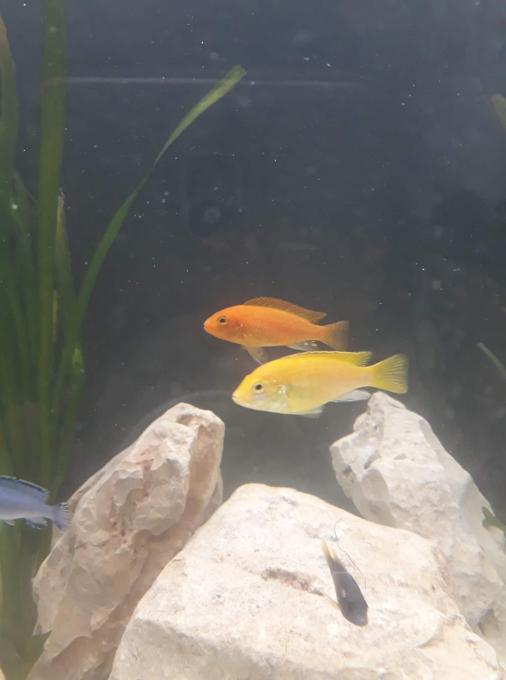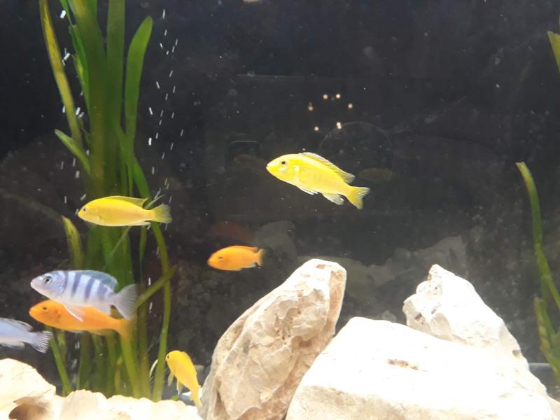 Για τα ψάρια (από που τα πήρες αν επιτρέπεται, από μαγαζί ή χομπίστα?) τα πορτοκαλί που βλέπω, αυτά που μάλλον λες saulosi, έχω την υπόνοια ότι είναι υβρίδια "red coral", επίσης στα κίτρινα "λαμπίντο" δεν διακρίνω σκούρη ρίγα στο ραχιαίο πτερύγιο (αν δεν υπάρχει είναι υβρίδια). Ξεχωρίζω ένα socolofi (το γαλάζιο με τη σκούρα ρίγα στο ραχιαίο), ένα maingano και acei. To γαλάζιο με τις κάθετες σκούρες ρίγες δεν ξέρω τι είναι (κάποιο Metriaclima πιθανά - μου κάνει και για θηλυκό Metriaclima lombardoi). |