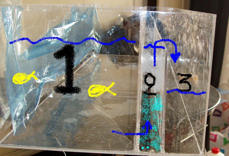 στην δεύτερη είναι ο χωρος που θα μπει σφουγκάρι και μακαρόνι. Στην τρίτη είναι οι είσοδοι του φίλτρου .Υπάρχουν 6 τρύπες ώστε να μπορεί το ενυδρείο να χωριστεί σε 6 μικρότερα (5 λίτρα το καθένα) με χωρίσματα ασπρα πλεξιγκλας. |
