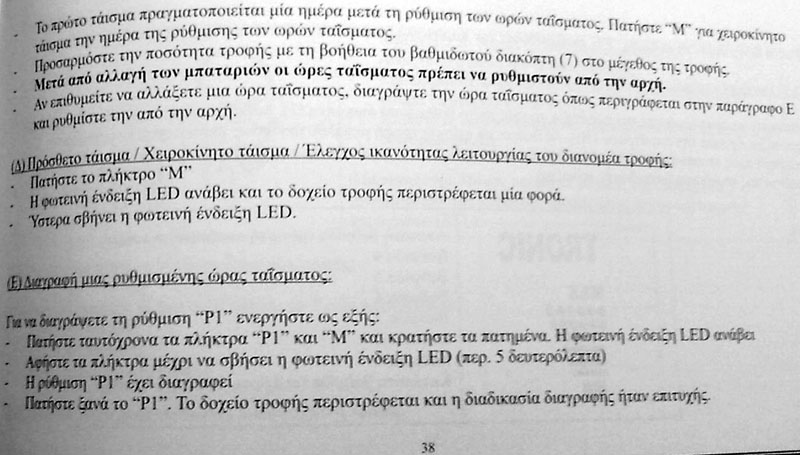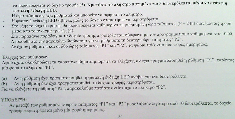 Το μεσαίο κουμπί ταίζεις χειροκίνητα. Για τα άλλα δύο (κουμπιά προγραμματισμού ) ισχύει η εξής απλή λογική: Την ώρα που θα πατήσεις το κουμπί θα ταίζει κάθε 24 ώρες. Π.Χ: Οπότε για να ταίζεις πρωί - βράδυ... Πατάς μια φορά το ένα κουμπί το πρωί (την ώρα που θέλεις) και το βράδυ την ώρα επίσης που θέλεις πατάς το άλλο. Παρακολουθείς την επόμενη μέρα ότι δουλεύει. Για το reset χωρίς να είμαι σίγουρος νομίζω ότι η μνήμη διαγράφεται εάν πατήσεις ταυτόχρονα τα δύο κουμπιά προγραμματισμού. μια δοκιμή θα σε πείσει... τελικά με πρόλαβε ο DJK....(p;ote to σκάναρες ρε θηρίο..... καλές διακοπές, Caverman |