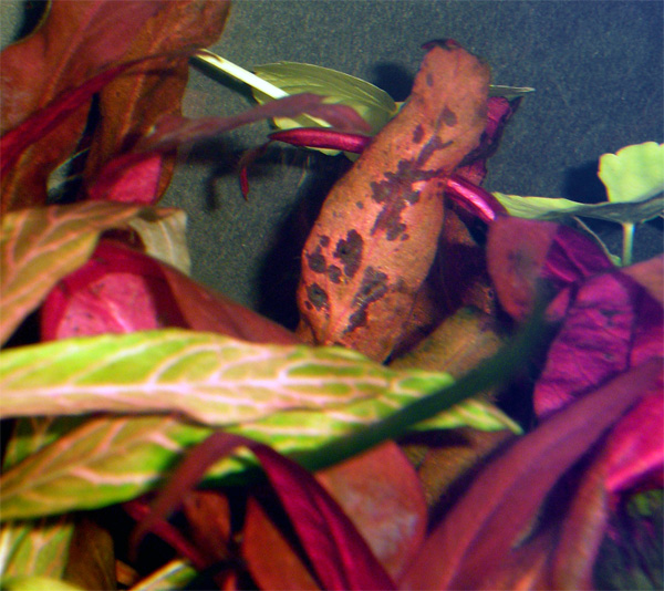 Γεια σε ολους! To reineckii μου τις τελευταιες μερες εχει κατσαρωσει και εμφανιστηκαν λιγες τρυπες σε μερικα φυλλα.Και ο εχινοδορος παρουσιαζει σαπισμα στα εξωτερικα φυλλα του. Υποψιαζομαι ελλειψη Καλιου η ασβεστιου. Να πω οτι το ενυδρειο ειναι πυκνοφυτεμενο 80λιτ και τρεχει απο 2/9/07. Λιπανση καθημερινα της Ocean nutrition ( k,Mg,S και Ca) ,1mg 'ημερα.Υποστρωμα της Sera. Χτες αγορασα της Seachem potassium και iron. Εχω παροχη CO2 DIY. ΡΗ 6,8 και ΚΗ 6.FΦωτισμο 69watt.Μηπως να αυξησω την δοση; σκεφτομαι σιδηρο και καλιο να βαζω παλι 1ml/ημερα αποτο καθενα.Κλαδεμα της Alternanthera που μπηκε στο μονομαχοενυδρειο 12λιτρων παει πολυ καλα και τα φυλλα του ειναι ισια και υγιεστατα. Επισης εχω κι εναν επισκεπτη..μπορει καποιος να μου πει αν τρωει φυτα το σαλιγκαρι αυτο;