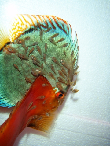 Μετά από αρκετές προσπάθειες νομίζω ότι μπορώ και εγώ πλέον να μιλάω για αναπαραγωγή δίσκων. Οι γονείς δύο pigeon blood ποτέ δεν κατάφεραν να μεγαλώσουν μόνοι τους το γόνο. Σε κάθε γέννα (5 – 6 μέχρι τώρα) και αφού τα μικρά δεν κατάφερναν να κολλήσουν στους γονείς για να τραφούν επερχόταν το μοιραίο. Τι ανοιχτού ή σκούρου χρώματος background, τι πλάγιος, τι έμμεσος φωτισμός, τίποτα δεν βοηθούσε. Τελικά μάλλον δεν παρήγαγαν την απαραίτητη ουσία για να θρέψουν τα μικρά τους.
