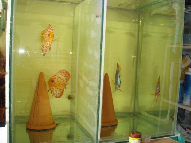 ......Οι πρώτες φωτογραφίες είναι από μία ομάδα έξι ψαριών που έβαλα στο ενυδρείο όπου υπήρχαν αρχικά τα ζευγάρια των δίσκων πριν αρχίσουν την αναπαραγωγή. Τα μεγάλα είναι τώρα μονίμως στις γεννήστρες. Η ανάπτυξή τους δεν συγκρίνετε με αυτήν των υπολοίπων ψαριών που είναι ακόμα σε άλλο ενυδρείο συνδεδεμένο στη σειρά με τις γεννήστρες όπου γίνετε συνεχείς αλλαγή νερού. Οι υπόλοιπες φωτογραφίες καταγράφουν την διαφορά αυτή. Ενώ στα 6 ψαράκια η ανάπτυξη προχωράει με αργότερους ρυθμούς και έχουν και αρκετά μαύρα στίγματα (στις φώτογραφίες φαίνονται και μερικά από spot algea μην μπερδευτείτε, δεν είναι και τόσο πολλά) τα υπόλοιπα ψαράκια έχουν μεγαλώσει περισσότερο και είναι καθαρά χωρίς σχεδόν καθόλου στίγματα.