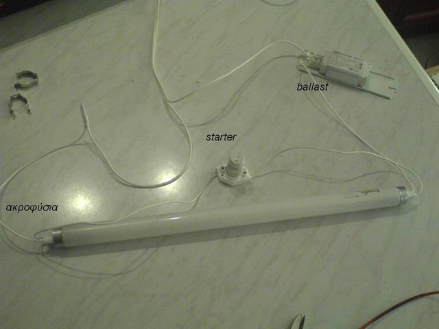 Αν κατάλαβα καλά, έχεις πάρει μόνο τα ακροφύσια.. Αν είναι για Τ5, θέλεις μόνο ένα ηλεκτρονικό ballast (δεν είναι και τίποτα δύσκολο η συνδεσμολογία, και μάλιστα έτσι σου έρχεται και πιο φθηνά).. Αν είναι για Τ8, εκτός από το σχετικό ballast χρειάζεσαι και starter (δεν ξέρω αν υπάρχουν ηλεκτρονικά ballast και για T8, που να δουλεύουν και χωρίς starter)..