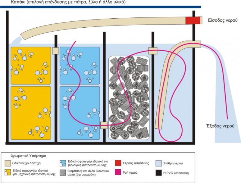 Απλά δύο λόγια για το φίλτρο που πρόκειται να φτιάξεις. Ουδέποτε μίλησα για μη λειτουργική χρήση μιας αντλίας εκτός νερού και ουδέποτε έχω μιλήσει για φίλτρανση με τον τρόπο που τον παρουσιάζεις, πράγματα που εμένα προσωπικά με βρίσκουν σύμφωνο. Αυτά έχουν να κάνουν και με τους χίλιους τρόπους που μπορεί να φτιαχτεί κάτι σε μια λίμνη και βεβαίως δεν έχει τίποτε να κάνει με τους σωστούς κανόνες διατήρησης, απλά την υποδομή και υποστήριξη. Επίσης, ουδέποτε έχω μιλήσει εναντίων των έτοιμων φίλτρων της αγοράς, φτάνει να είναι αξιόπιστα και να πληρούν κάποιες προυποθέσεις. Δόξα τον Θεό, το διαδίκτυο είναι γεμάτο ονόματα εταιρειών που ευτυχώς εύκολα μπορείτε να διακρίνετε ποιότητα και αξιοπιστία. Έναν νέο οπαδό της λίμνης μάλιστα, θα τον προέτρεπα να πάει απ'ευθείας στην έτοιμη λήση μέχρι να είναι έτοιμος να δημιουργήσει και να χειριστεί μια λήση DIY. Αντιλαμβάνεστε φίλοι, ότι από εδώ και εμπρός το έργο μου δεν θα είναι τόσο εύκολο, γιατί θα πρέπει σιγά-σιγά με τον Σωκράτη και τα άλλα παιδιά να διαμορφώσουμε την κατηγορία με τις τελευταίες προδιαγραφές. Θα εκπλαγείτε πόσο έχουν αλλάξει κάποια πράγματα τώρα σε σχέση πάντα με υλικό και βιβλιογραφία πριν 10 χρονών, όπου και ξεκινούσα δειλά-δειλά τα τις λίμνης. ΤΟ ΚΟΙ σαν ΡΕΤ είναι κάτι σαν θρύλος. Δεν μπορείτε να φανταστείτε πως μιλάνε κάποιοι λιμνόφιλοι για τα 8-10 ψάρια τους και για τη σχέση τους με αυτά, που καμία απολύτως διαφορά δεν έχει η συμπεριφορά τους στα ΚΟΙ απ' ότι στα σκυλιά τους. Μάλιστα 8-10 ΚΟΙ μόνο σε λίμνες άνω των 10.000-15,000 λίτρων. Η σχολή αυτή που εν μέρει θα υιοθετήσω και εγώ στη καινούρια μου λίμνη πιστεύει ότι κάθε ενήλικο ΚΟΙ θέλει 1000 λίτρα χώρο. Αυτά όμως, για το μέλλον. Καθαρά ο κλάδος δηλώνει ότι "ο σωστός λιμνίφιλος δεν φίνεται αυτός που θάβει ένα κομμάτι λάινερ στο χώμα". Όπως ακριβώς "ο σωστός ακουαρίστας δεν είναι αυτός που έχει απλά ενυδρείο"... Ομολογώ ότι αν το αναλύσετε έχει πολλά διδάγματα. Ο σκοπός της κατηγορίας αυτής, αν θέλουμε να πάμε μπροστά πρέπει να σκανάρουμε και να πάρουμε παραδείγματα από τον παγκόσμιο παλμό, διαφορετικά, κάποιοι φίλοι που γνωρίζουν καλά το θέμα και ίσως δουν καμιά φορά τους διαλόγους μας εδω θα μας κοροϊδεύουν. ΑΠΑΙΤΩ για ακόμα μια φορά να κάνετε υπομονή γιατί υπάρχει τρομερή δουλειά να γίνει ώστε να επωφεληθούν και οι νεότεροι φίλοι που θα ενταχθούν στην κατηγορία μας στο μέλλον. Στέλνω κάποια σχεδιαγράμματα και φώτο που μπορούν να χρειαστούν για την δημιουργία σου. Να ξέρεις μόνο ότι η λίμνη 3500 λίτρων απαιτεί φίλτρανση/χώρο 350 καθαρών λίτρων. Επίστης φωτογραφίες του δικού μου φίλτρου (μικρή λίμνη) Θα κάνω παρουσίαση σύντομα πριν την ξηλώσω. Συνεχίζω όμως να επιμένω για την αντλία στο βαθύτερο σημείο