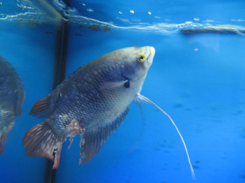 Εδω και εναν μηνα το giant gourami που βλεπετε στην φωτο εχει αρχισει και αλλιωνεται το δερμα του και τα πτερυγια του.Ενας ιχθυολογος απο pet city μου ανεφερε βακτηριακη μολυνση και μου εδωσε bactopur direct της sera. Ολοκληρωσα την θεραπεια του και δεν ειδα καμια βελτιωση. Ξαναπηγα στο pet city και το παλικαρι μου ειπε οτι το bactopur direct οτι δουλεια ηταν να κανει την εκανε. Οποτε μου εδωσε to melafix της Αpi για να κλεισουν οι πληγες του ψαριου. Κανω θεραπεια εδω και μια βδομαδα με το melafix και οχι μονο δεν εχω δει βελτιωση στο ψαρι, αλλα μου κολλησε κι ενα αλλο ψαρι,ενα texas το οποιο εχει βγαλει εδω και τρεις μερες ενα σπυρι (φαινεται στην φωτο) και σημερα ανακαλυψα κι ενα δευτερο. Παρακαλω πολυ οποιος γνωριζει κατι να μου πει γιατι δεν θελω να χασω τα ψαρια! (Εχω κι ενα oscar το οποιο προς το παρον δεν δειχνει σημαδια μολυνσης) Ευχαριστω εκ των προτερων! |