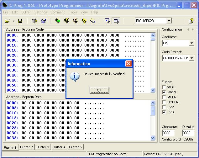 οκ μέχρι εδώ τώρα κόλλησα σε σε άλλο πρόβλημα πατάω erase all για τυχόν άλλο πρόγραμμα μου λέει οκ πατάω read all και μου βγάζει όλες τις γραμμές του κώδικα μηδενικά (λογικά είναι άδειο) οκ ανοίγω το αρχείο f.hex οκ ανοίγει πατάω program all και βγάζει "verify failed at address 0000h" (φώτο 1) πατάω ξανά read all και μου βγάζει όλες τις γραμμές του κώδικα μηδενικά όπως πριν, αν με αυτό(εννοώ τα μηδενικά σαν πρόγραμμα ) πατήσω program all βγάζει "device successfully verified" (φώτο 2) τι κάνουμε εδώ δεν μπορώ να βρω κάτι στο Internet. γνωρίζει κανένας τπτ ; |