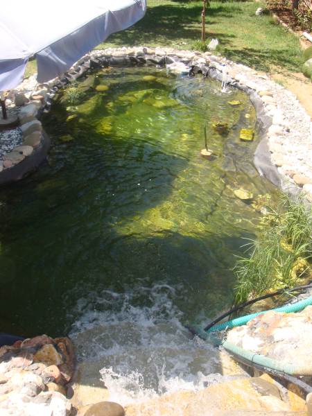 Αν δεν σου περισσεύουν πάρε τον μεγαλύτερο κουβά που μπορείς να βρεις φόρτωσε τον με βιολογικό υλικό Κ1 και βάλε από κάτω από αυτό μια βάνα για να μπορείς να το αδειάζεις εύκολα. Ένα ανακάτωμα με ένα ξύλο του υλικού αφού και ανοίγοντας την βάνα καθαρίζεις το φίλτρο σε 2 λεπτά. Εννοείτε ότι όλο το νερό της λίμνης θα περνάει από Κ1.