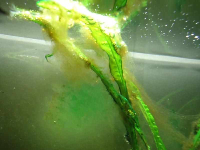 Πιο χαμηλη ενταση, πιο λιγες ωρες αναμμενο, αλλα κελβιν, πιο μακρυα το φως απο το ενυδρειο αν γινεται. Ή βαλε και κανενα φυτο ακομα. Τι λαμπα εχεις? ποσες ωρες λειτουργιας εχει μεχρι τωρα?