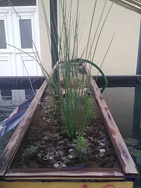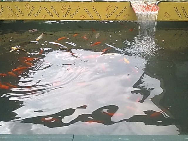 απο φυτα εβαλα μονο 6 μεγαλες γλαστρες νουφαρα και μια ποτεδερια αν τη λεω σωστα εχει περιπου 30 χρυσοψαρα και 6 κοι.