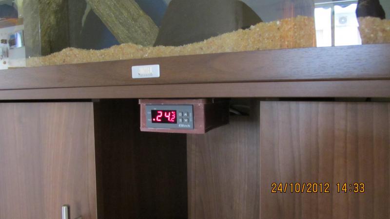 Το ενυδρειο στηθηκε. Σχεδον ολα μπηκαν στην θεση τους. Υπαρχει ενα προβληματακι ομως με το κουτακι που εχω τον ρυθμιστη θερμοκρασιας. Δεν ξερω πως να το στερεωσω στο επιπλο. Θελω να αποφυγω το τρυπημα στο ξυλο.