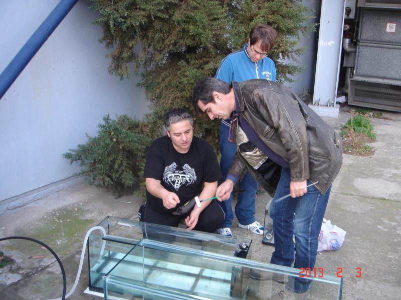 ------------------------- Σημερα περασαμε πολυ ωραια! Εγιναν πολλες δουλειες, γιατι με πολλα χερια ξεμπερδευουμε ευκολα και γρηγορα. Να ευχαριστησω το Μπαμπη (Bloskas), Νικο (narampa), Στεφανο (sarpijk) και την κοπελα του (Ελσα) για την πολυτιμη βοηθεια για να καθαρισουμε ολα τα ενυδρεια και την αμμο, οπως και να ντυσουμε και βαψουμε τις βασεις. Οι βασεις εγιναν πολυ ωραιες, με το μονταρισμα του snakepanos. Να ευχαριστησω επισης το narampa για το εσωτερικο φιλτρο και το θερμοστατη που προσφερε χθες, οπως και τον sarpijk για το εσωτερικο φιλτρο που εδωσε σημερα. Ε, καποιο απο αυτα θα κανει για τη μονομαχιερα! Guest Star ο Κλεοβουλος, που περα απο το ΤΣΙΠΟΥΡΟ και τα ΛΟΥΚΑΝΙΚΑ που εφερε, καθαρισε και ενα ενυδρειο Αυριο συνεχιζουμε με το τελικο στησιμο των ενυδρειων και τα τσιπουρα, οπως και τα λουκανικα που θα τα εχουμε ψημενα Για την ωρα που θα παμε, θα υπαρξει ποστ αργοτερα.