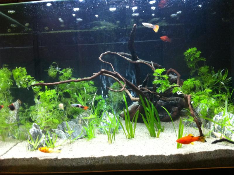 Διαστάσεις: 60x30x40 Όγκος: 72 λίτρα Κατηγορία: Νότια Αμερική, Βενεζουέλα, Γουιάνα, Βραζιλία Ψάρια: 3 Poecilia reticulata (guppy) , 2 Xiphophorus maculatus (platy) , 1 Xiphophorus hellerii (Ξιφοφόρο) και 1 Apple snail (Ήταν μέσα στα φύτα) Φυτά : cabomba caroliniana , echinodorus tenellus , sagittaria subulata , stargrass Διακοσμητικά υλικά: Άμμος, πέτρες, red moorwood Φόντο: Διακοσμητική πλάτη ενυδρείου (Μαύρο χαρτόνι) Διάρκεια φωτισμού: 8 ώρες Φιλτράρισμα: Τύπος Αμμβούργου με ΕΗΕΙΜ compact 300 Θερμοστάτης: 150 Watt pH:7,5-7,8 Γενική σκληρότητα (GH):15 Ανθρακική σκληρότητα (ΚΗ): Αμμωνία (ΝΗ3):0 Νιτρώδη (ΝΟ2):0 Νιτρικά (ΝΟ3):15 Αλλαγές νερού:30% την βδομαδα Θερμοκρασία:23 Άλλες πληροφορίες: Στο στήσιμο βοήθησε ο Stivv ΆΠΕΙΡΑ ! Θέλω την άποψη σας για την αλλαγή των ψαριών μου . P.S. Ξέρω ότι κάποια στιγμή μπορεί να υβριδίσουν αλλά ποιός είπε ΟΧΙ από την πρώτη ματιά ?? |