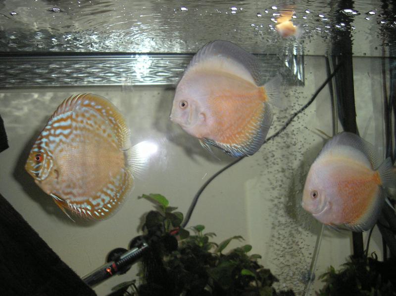 Σημερα μετακομισαν οι δισκοι. Στηθηκε το 120αρι, barebottom, 2 ριζες απτο μεγαλο, ενα φιλτρο απτο μεγαλο, νερο απτο μεγαλο, pistia και κερατοφυλλο ( απτο μεγαλο ) και παμε ταισμα. Οφειλω να πω οτι με αφησαν αναυδο, ταχα ολα ετοιμα, και λεω παμε, και ξεκιναω το κυνηγι, εκτος οτι μου σπασανε τα νευρα, οσο τους κυνηγουσα, ΤΟΣΟ ΞΕΠΙΠΕΡΙΑΖΑΝΕ! μηπως να βαλω κανα πιρανχας μεσα να λαμποκοπανε? Τελωσπαντων με τα πολλα με τα λιγα τους εβαλα στο 120αρι, εχουν καθαρισει μεχρι τωρα που κλεισανε τα φωτα, ολοι, εκτος απο εναν, που και πριν ηταν ο πιο πικαντικος απο ολους. Θα στρωσει που θα παει.