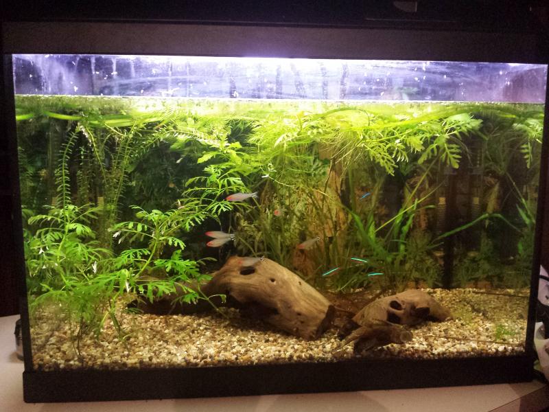 μια χαρα σε βλεπωπροσθεσε μερικα φυτα στην επιφανεια μολις μπορεσεις.θα αρεσουνε και στον μονομαχο και στους καρδιναλιους.αν μπορεσεις να βρεις ιακυνθο του νερου η ακομα καλυτερα και κατι σε μορφη καλαμιου/βουρλου θα δεις αλλο ψαρι