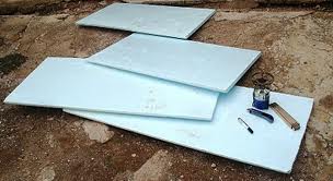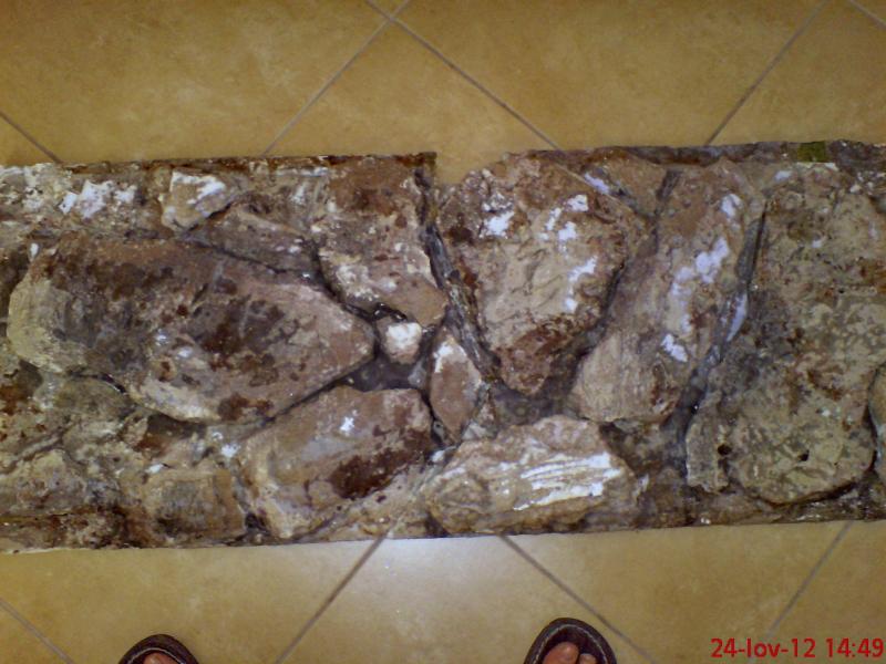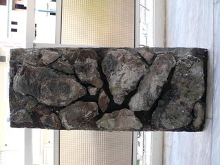 μετρησα τις διαστασεις του ενυδρειου και εκοψα ενα κομματι νταου σε αυτες. Εκοψα πολλα και διαφορων μεγεθων κομματια απο το ιδιο υλικο. Αφαιρεσα πλαινα με ενα μαχαιρι -δαχτυλα για να παρουν οψη πετρας. Αρχισα να κολαω με σιλικονη τα κομματια. Χρησιμοποιωντας πινελο απλωνοντας σιλικονη εβαζα αμμο.