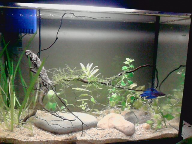 Κατηγορία:Betta Φυτά:Valisneria Americana,Hygrophila polysperma , Rotala macrandra Variegated .lemna minor, moss.. Ψάρια / ¶λλα είδη:betta splender Spade tail , αρκετά trumpet snails Διακοσμητικά υλικά:ρίζα, πέτρες, αμμος Φόντο:- Φωτισμός:Fluorescent light 11 Watt Διάρκεια φωτισμού: 9 ωρες Φιλτράρισμα:3 stage filtration kit (sponge, active carbon and expanded clay) Θερμοστάτης:Scuba Heater 25 Watt Αεραντλία:- Παράμετροι: pH: περίπου 7,2 Γενική σκληρότητα (GH):περίπου 8 dGH Ανθρακική σκληρότητα (ΚΗ):περίπου 10 Αμμωνία (ΝΗ3):0 Νιτρώδη (ΝΟ2):0 Νιτρικά (ΝΟ3):10mg/L Αλλαγές νερού:καθε εβδομμαδα 30% Θερμοκρασία:26 C