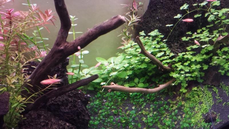 Δεν πηγαν τα πράγματα οπως τα ειχα υπολογισει,λογω των ψαριων αφαιρεθηκε μεγαλο μερος απο το χαρντσκεηπ(για να εχουν χωρο),και λογω red cherry εγινε χαμηλου φωτισμου χωρις co2 και λίπανση
