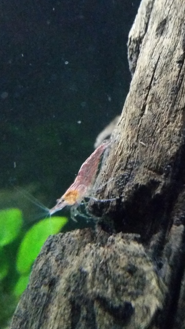 Αυτό που δεν περίμενα όμως ήταν οι αλλαγές στην πανίδα: Ανακάλυψα έναν νέο ένοικο! Υποθέτω ότι είχε μετακομίσει ως αυγό πριν από ένα τρίμηνο, μαζί με τα φυτά που πήρα από συν-φορουμίστα (από γαριδάδικο που διέλυσε). Αναγνωρίζετε τι είδος είναι; Έχει ελπίδες να συμβιώσει με τα fancy; Ελπίζω πως ναι, αφού ξέφυγε ως τώρα και έχει φτάσει σε μέγεθος που δεν χωράει στο στόμα τους (μέχρι να μεγαλώσουν βέβαια κι αυτά).