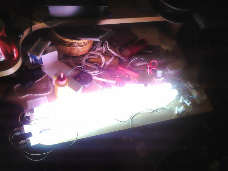 Τελος και τα φωτα!! αποτελουμενα απο 3 τ8 2 περιπου 60 cm και μια περιπου 40 cm , Το φωτιστικο του ενυδρειου χωραει κανονικα 2 τ8 , ομως με λιγη πατεντα πειρε και μια μικροτερη,, κοπηκαν τα αυτια απο τα ballast με τροχο για εξηκονομηση χωρου , λαμπες -sylvania gro lux, flora , phillips 6,400..