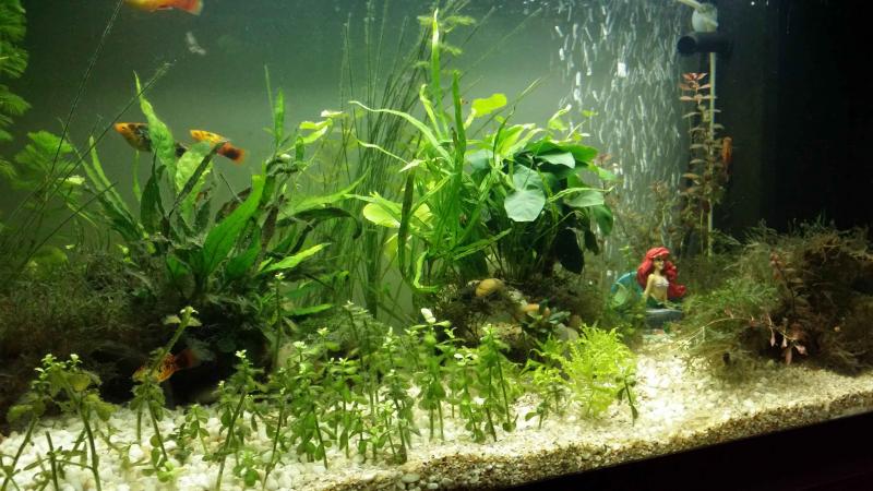 Διαστάσεις: 81x36x45 Λίτρα: 110lt Χρόνος λειτουργίας: 6 μήνες Τύπος και διάρκεια φωτισμού: 2 Τ8 18 watt/ 8 ώρες Co2 και τρόπος διάχυσης: excel 2,5ml/2 ημέρες Λίπανση: ταμπλέτες στις ρίζες και υγρό λίπασμα (all in one/microbe) 5ml 2 φορές τη βδομάδα Υπόστρωμα: Trpica aquarium soil 6lt Φίλτρανση: juwel ecoflow 500lt/h το εργοστασιακό βιολογικό φίλτρο έχει αντικατασταθεί με υαλοβάμβακα και κεραμικό υλικό Θερμοκρασία: 25 C pΗ: 7 NH3: 0 NO2:0 NO3:25mg/lt GΗ:179ppm KΗ:7 dKH Λίστα φυτών: cadomba caroliniana, ludwigia palustris,bacopa compact,microsorum pteropus,microsorum pteropus trident,hydrocotyle leucocephala,bucephalandra Brownie,anubia barteri nana,pogostemon helferi,taxiphyllum spiky Λίστα ψαριών: 1. platy: tuxedo, red coralκαι gold (περίπου 15 με 2 πρόσφατες γέννες - 10 ενήλικα) 2. clown loac x2 3. otocinclus affinis x2 Ρουτίνα αλλαγής νερού: 30%/εβδομάδα με seachem prime ------------------------- Διακοσμητικά: 2 ξύλα και 3 σωλήνες pvc για κρυψώνες. ------------------------- Οποιαδήποτε, πρόταση καλοδεχούμενη. Σηκώνω και μερικές photo. Τελευταία επεξεργασία από το χρήστη johnyl : 09-12-16 στις 18:05. Αιτία: Automerged Doublepost |