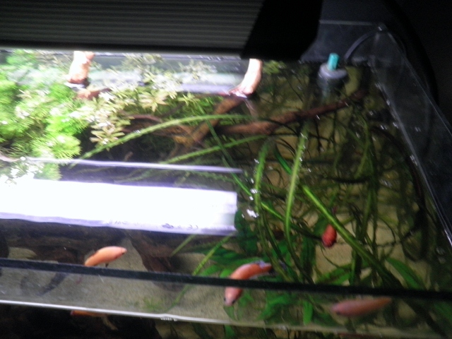 Διαστάσεις:78*31.5*35 Όγκος:70λτ Κατηγορία:βιοτοπικο; Φυτά:limnophila sessiflora,rotala rotundipholia,cryptocoryne crispatula var balansae-parva-wendtii green-willisii, vallisneria sp.,eleocharis parvula,pogostemon helferi Ψάρια / ¶λλα είδη:4 female bettas,1 male betta,7 rasbora hengeli,7 botia sidthimunki,red cherry shrims Διακοσμητικά υλικά: (χαλίκι, ξύλα κ.λ.π.) αμμος, ξυλο Φόντο: Φωτισμός:2*24 τ5 Διάρκεια φωτισμού:8 ωρες Φιλτράρισμα:enheim 2211 Θερμοστάτης:100w Λίπανση: Παροχή CO2: Παράμετροι: pH:7 Γενική σκληρότητα (GH):8 Ανθρακική σκληρότητα (ΚΗ):6 Αμμωνία (ΝΗ3): Νιτρώδη (ΝΟ2):0 Νιτρικά (ΝΟ3):15 Αλλαγές νερού:καθε εβδομαδα 15λτ Θερμοκρασία:25 ¶λλες πληροφορίες: Φωτογραφία: |