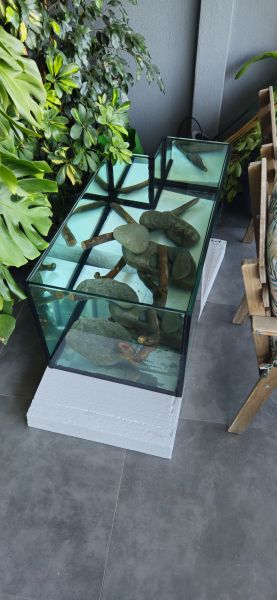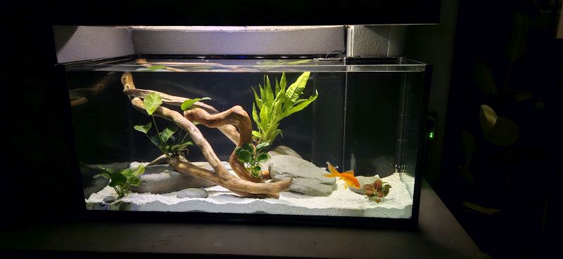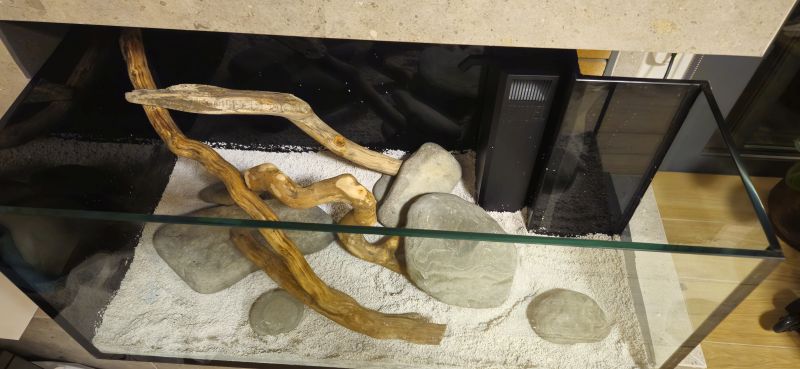 Διαστάσεις: 100.4Χ51.4Χ46 / ΜΠΥ με 12άρι τζάμι Όγκος: 225 λίτρα εξωτερικές διαστάσεις με 200 lt εσωτερικά (λογικά 180 καθαρά) Διακοσμητικά υλικά: Υπόστρωμα: Ηχομονωτικό 1 cm και ντύσιμο όλο το τζάκι με αυτό Άμμος: snow white Ξύλα: από Άραχθο ποταμό, βράσιμο σε νερό και τρίψιμο Πέτρες: από Άραχθο ποταμό, βράσιμο σε νερό και τρίψιμο Φόντο: μαύρο αυτοκόλλητο - έπρεπε να το κάνω με μαύρο τζάμι Φωτισμός: 6x 3.7w gu10 2200-6500k dimm tapo σε spot με plexy Διάρκεια φωτισμού: Προσομοίωση μέρα - νύχτα Φιλτράρισμα: Εσωτερικό φίλτρο juwel bioflow 3.0 600 L/H και με το σωληνάκι για οξυγόνο Θερμοστάτης: juwel 300w μέσα στο φίλτρο Καπάκι:Plexy με τις κατάλληλές οπές και ανοίγματα αλλά δυστυχώς το έκανα μισό πόντο και στράβωσε (έκατσε) στο κέντρο, οπότε τώρα που θα φτιάξω την καλοκαιρινή έκδοση θα το φτιάξω και αυτό στον ένα πόντο Έβαλα και τα φυτά μου, άλλα πάνω στα ξύλα και άλλα στο υπόστρωμα. Θα το εμπλουτίζω με τις αλλαγές. |