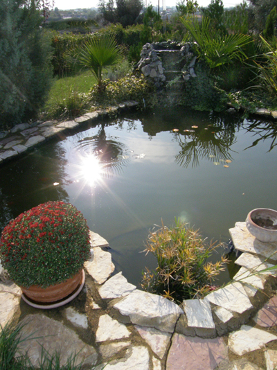 4 Κοι και γυρω στα 20 χρυσόψαρα ( ο αριθμος τους συνεχως αυξανεται οποτε δεν εχω ακριβη αριθμο). Το μεγαλυτερο Κοι ειναι γυρω στα 45 εκατ.Υπολογιζω οτι η χωρητικοτητα της ειναι 6000 λιτρα. Το βαθος της στο βαθυτερο σημειο ειναι 80 εκ. Εκτος απο ενα φιλτρο βαρελακι 50 λιτρων, χρησιμοποιω και μια UV 12 watts. Το νερο το αλλαζω μια φορα τον χρονο. Το νερο ανακυκλωνεται με μια υποβρυχια αντλια και επανερχεται μεσω ενος καταρρακτη. Τον χειμωνα τα παντα σταματουν (και η τροφη), ενω συνηθως τις κρυες μερες η λιμνη καλυπτεται απο παγο που πρεπει να σπασω για να βγουν τα αερια της λιμνης. Μερικες φωτογραφιες νομιζω ειναι απαραιτητες. |