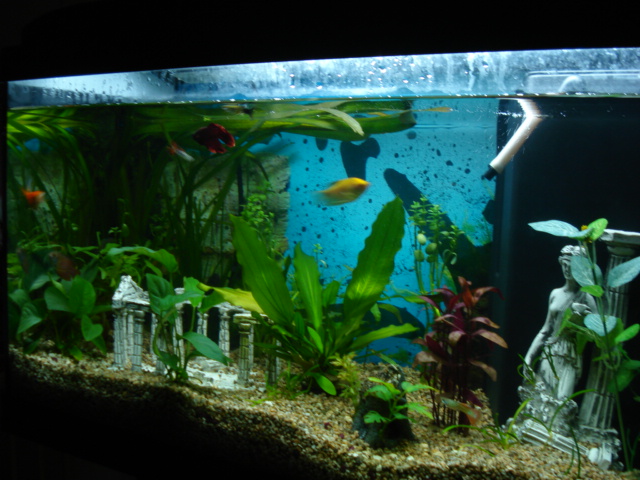 Το φυτό στο κέντρο(???) οι anubies και οι Valisneries αναπτύσονται πολύ καλά, τα άλλα τα βλέπω στάσιμα. Θέλει κι άλλα φυτα ια να κρύψω το άχαρο μαύρο φίλτρο, τι να βάλλω? για να δένουν?