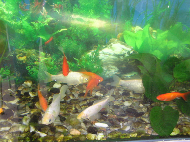 Με μία λάμπα UV λύθηκε το πρόβλημα της άλγης που έκανε το νερό να φαίνεται σαν βούρκος με αποτέλεσμα να μην μπορώ να δώ τα ψάρια. ¶λλαζα το νερό σχεδόν κάθε βδομάδα τα 3/4 και την επόμενη ήταν καταπράσινο.Οι τιμές των μετρήσεων ήταν φυσιολογικές αλλά αισθητικά δεν ήταν ότι καλύτερο... Παραθέτω φωτογραφίες για να δείτε ότι και τα βότσαλα που ήταν καταπράσινα σχεδόν μαύρα μέσα σε 2 μέρες άρχισαν να καθαρίζουν και αυτά. Τώρα χαίρομαι να χαζεύω τα χρυσόψαρά μου και το Κοι στο ενυδρείο μέχρι να μεγαλώσει η λίμνη και να βαθύνει για να μετακομίσουν εκεί. |