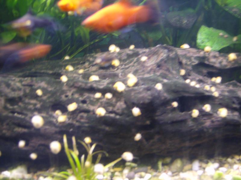 Το ενυδρειο ειναι 60 λιτρα και ειχε 3 τετοια σαλιγκαρια... γεννησανε γυρο στα 6 "σακουλακια" και τα αφησα εκει χωρις να τα πηραξω... Τωρα υπολογιζω οτι το 90% των σαλιγκαριων επιβιωσαν!.... Το ενυδρειο εχει πραγματικα γεμισει με εκατονταδες μικρα κιτρινα μπαλακια... ...τα συνηθυσμενα σαλιγκαρια που ερχονται απο τα φυτα των πετσοπ εχουν εξαφανιστει... Καθημερινα μεγαλωνουν και και καποιες φορες το χαλικι δεν φαινετε απο τα σαλιγκαρια που ειναι πεσμενα εκει Αντε να δουμε τι θα τα κανω... Υ.γ. αλήθεια τρώγονται?...
