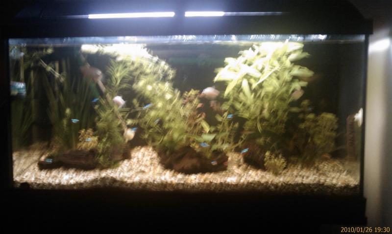 Διαστάσεις:80*30*40 Όγκος:μικτα 96λιτρα γυρω στα 80 καθαρα Κατηγορία:κοινωνικο με λιγα φυτα Φυτά:java moss, anubia, valisneria, υδροφυλλια πολυσπερμα, columbia carolina, μια κρυπτοκορινα, ενα κοκκινο (δεν ξερω τη), ενα νουφαρο και κανα δυο αλλα (μια ρικα νομιζω) και βοηθιστε τι αλλο. Ψάρια / ¶λλα είδη: 15 νεον-καρδιναλιοι (εχουν μπερδευτει και δεν μπορω πια να μετρισω ποσα απο το ενα ποσα απο το αλλο ειναι... Διακοσμητικά υλικά: χαλικι, ξυλα (χαλίκι, ξύλα κ.λ.π.) Φόντο:μαυρο χαρτονι Φωτισμός: 2*18w t8 sylvania flora (και ετοιμαζω μια ακομα τ5 24w) Διάρκεια φωτισμού: 8,5 ωρες Φιλτράρισμα: eheim 2215 με καδο γεματο σπιροραξ και σταμαρτ προ Θερμοστάτης: 150w Λίπανση: iron tetra, flourish γενικο, κ flourish trace Παροχή CO2:diy Παράμετροι: pH:7 Γενική σκληρότητα (GH): 8 Ανθρακική σκληρότητα (ΚΗ): 5 Αμμωνία (ΝΗ3):0 Νιτρώδη (ΝΟ2):0 Νιτρικά (ΝΟ3):12.5 Αλλαγές νερού: 20% καθε κυριακη Θερμοκρασία:26-27 ¶λλες πληροφορίες: Φωτογραφία: ειναι φωτο πριν 2 βδομαδες, τωρα η καρυδα εχει βγει (δεν μου αρεσε καθολου...) οπως και τα ψαρακια στην πρωτη φωτο γερμαικα τετρα μου τα εχουν πει. ξερει κανεισ τη ψαρακια ειναι? ενω στην τελευταια φωτα βλεπετε την αρχη του ταξιδιουμου στο χομπι.. με φυτα χωμενα στο χαλικι με τα γλαστακια... (ετσι μου ειπαν στο πετ σοπ... περιμενω απο ολουσ συμβουλες και παρατηρισεις και τα σχολια σας... |