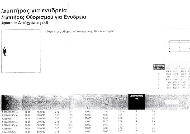 Θα Πω Για Αρχη Οτι Το Ενυδρειο Μου Τρεχει Εδω Και 5Μηνες. Πολλα Πραγματα Με Εχουν Βοηθησει & Πολλα Με Εχουν Μπερδεψει... Δεν Εχω Παρουσιασει Ακομα Το Ενυδρειο,Ισως Με ''Τρομαζουν'' Οι Αρνητικες Αποψεις... Μιας Κ Εχω Βοηθηθει Αρκετα Ομως,Ειπα Να Συνεισφερω Κ Εγω Κατα Καποιο Τροπο. Διαβαζω Αρκετα Θεματα Για Λαμπες Ενυδρειου,Διαστασεις,Αποδοσεις,κλπ... Σας Παραθετω Πιο Κατω Εικονες. Αφορουν Λαμπες Ενυδρειου Απο Δυο Εταιρειες. SYLVANIA-PHILIPS Να Γραψω Για Αρχη Οτι΄΄Καθε Λαμπα T8 (Χοντρη Λαμπα Φθοριου-Συνηθισμενη Λαμπα Γραφειου) Ειτε T5(Μικροτερη Λαμπα Φθοριου-Συνηθιζεται Για Κρυφους Φωτισμους) Αναλογα Με Τα Watt(Καταναλωση Λαμπας)Βγαινουν & Οι Διαστασεις. Η Καταναλωση Λαμπας Φθοριου Δεν Διχνει Την Αποδοση της Λαμπας. Η Αποδοση Μπορει Στο Περιπου Να Υπολογιστει Αν Πολλαπλασιασουμε Τα Watt Επι 4 & Ειναι Η Αντιστοιχη Σε Μια Κοινη Λαμπα Πυρακτωσεως. Ωραια Λοιπον΄΄Εχω 2 λαμπες Φθοριου Απο 11W,Σε ΄Κοινη΄Λαμπα Τι Αποδοση Εχει;Συνολο Watt 22 * 4 =88watt. Αυτη Ειναι Η Τιμη Σε Μια Λαμπα Πυρακτωσεως. Προσοχη΄΄Αυτο Ισχυει Μονο Για Λαμπες Φθοριου. Σας Δινω Τους Καταλογους Για της Λαμπες Των Ενυδρειων & Καποια Χαρακτηριστικα Αυτων. Θα Σας Γραψω Οτι Εχω Αφαιρεσει Τις Τιμες Μιας & Αν Τις Δειτε Θα Πειτε Οτι Κατι Εχω Κανει Λαθος.Απλα Δεν Θελω Να Ερθω Σε Αντιπαραθεση Με Ατομα Που Ζουνε Απο Αυτες Τις Πωλησεις...Μια Ερευνα Αγορας Παντα & Σε Οτιδηποτε Χρειαζεται...΄΄Οικονομικη Ψυξη΄΄... Υπαρχουν & Στεγανα Ακροφυσια Που Ζητατε Πολλοι. Διπλα-Μονα-T5 & T8.(Θα Παρακαλεσω....Εκει & Αν Χρειαζεται Ψαξιμο Στην Τιμη) Οι Δυο Πρωτες Αφορουν Την Sylvania & H Τριτη Την Philips. Τυχον Διευκρινησεις_Ειμαι Προθυμος Αν Γνωριζω...