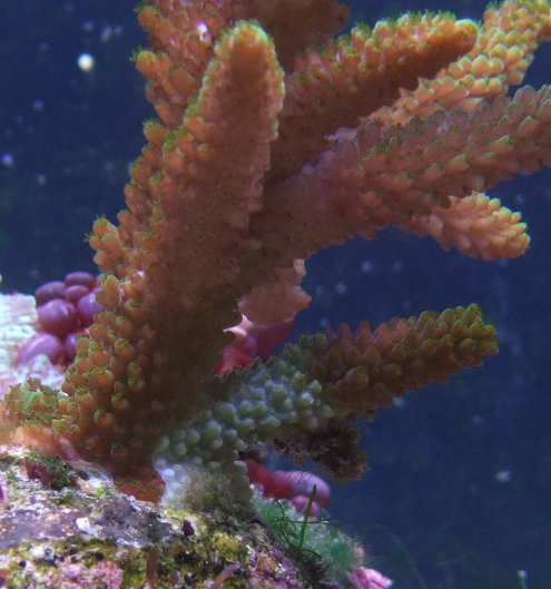 το κοραλλάκι της φωτογραφίας πριν 2-3 εβδομάδες άρχισε να ασπρίζει χαμηλά ... τότε δεν έδωσα σημασία, θεώρησα ότι θα σταματήσει .... όπως μπορείτε να δείτε όμως αυτό εξαπλώνετε σε μεγάλη κλίμακα ποια ... το υπόλοιπο κοράλλι φαίνεται υγιέστατο και μεγαλώνει με πολύ γοργούς ρυθμούς ... τι μπορεί να φταίει ??? πρέπει να κάνω κάτι για να το σταματήσω ? γενικά η μετρήσεις μου είναι καλές ... πέραν ίσος από λίγα νιτρικά που έχω ... αλλά πολύ λίγα ... |