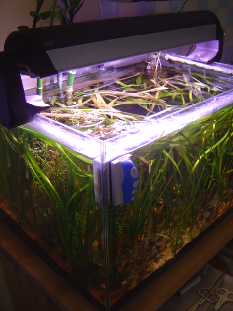 Όπως θα δείτε και στις πρόχειρες φώτο που ακολουθούν (από τον ενθουσιασμό μου δεν μπορούσα να περιμένω να νυχτώσει) το ενυδρείο είναι εντελώς εγκατελλειμένο από αισθητική άποψη, δε καθαρίζω καθόλου άλγες, δε λιπαίνω και δε κλαδεύω καθόλου. Το αποτέλεσμα είναι να το χουν πνίξει οι βαλισνέριες και τα περισσότερα από τα υπόλοιπα φυτά να φθίνουν... Οι ρουτίνες των αλλαγών νερού κάθε 7-10 μέρες και του συχνού ταΐσματος με 3-4 διαφορετικές τροφές τηρούνται όμως ανελλιπώς.
