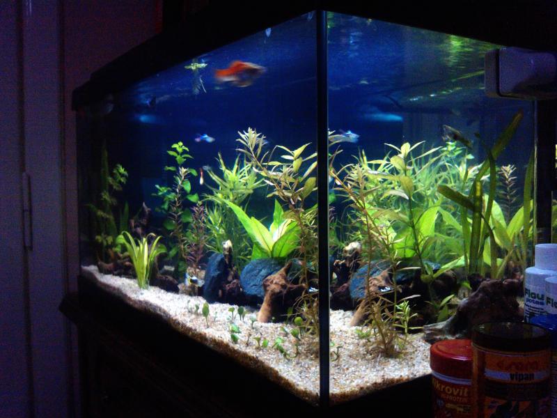 Έχουμε και λέμε: Διαστάσεις ενυδρείου :60 x 30 x 30 Καθαρά λίτρα είναι γύρω στα 180. Φόντο μαύρο χαρτονι. 10 κιλά χαλικι ψηλο,μερικές πέτρες και ξύλα Διαφορα φυτα τα οποια δεν ξερω την ονομασια τους Φίλτρανση : εσωτερικο eheim 150l/h Θερμοστάτες : 1 Jager 100 Watt. Φωτισμός : 1 x 15 Watt Απο ψάρια : 4 γκαπυ (2 θυληκα και 2 αρσενικα) 2 ξιφοφορους (ζευγαρι) 1 apple snail 2 zebra snails 2 γαριδουλες Παραμέτροι νερού: pH:7,5 Γενική σκληρότητα (GH):7 Ανθρακική σκληρότητα (ΚΗ):6 Αμμωνία (ΝΗ3):0 Νιτρώδη (ΝΟ2):0 Νιτρικά (ΝΟ3):0,20mg/l Αλλαγές νερού:καθε 1εβδομαδα 30% Θερμοκρασία:25,5 C |
