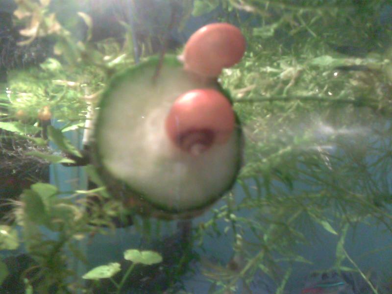 πρίν απο λίγες μέρες άρχισα να δοκιμάζω διάφορα λαχανικά στα apple snails ...τους έβαλα καρότο , μαρούλι , μπρόκολο....τα τιμούσαν όλα μα με αυτο που μόλις το βάλω σε 10 λεπτα το έχουν περικυκλώσει όλα είναι το αγγούρι ... να μερικές φωτογραφίες