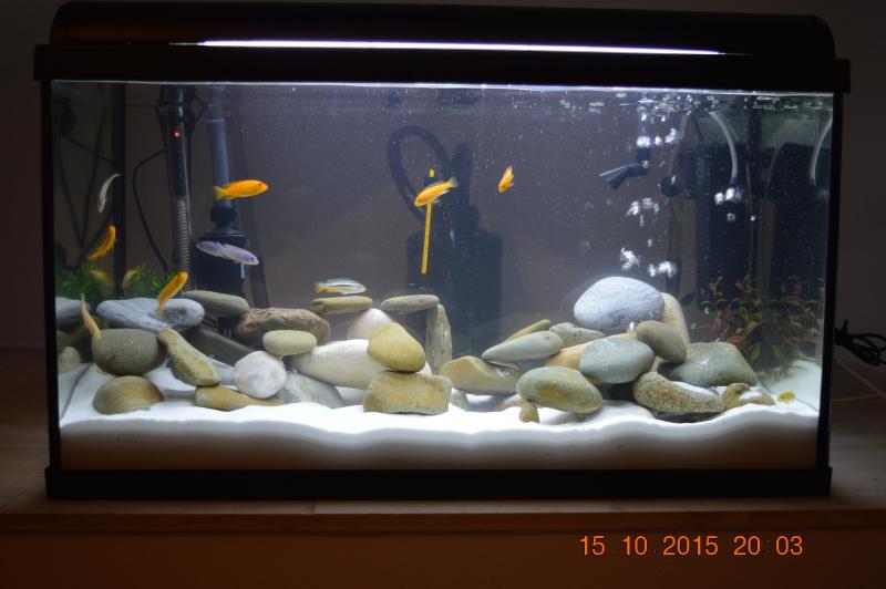 Διαστάσεις:1,10 Όγκος:180 Φυτά:2 ΠΛΑΣΤΙΚΑ Ψάρια / ¶λλα είδη: 12 ΚΙΧΛΙΔΕΣ MALAWI (Labidochromis caeruleus (Albino) Albino Yellow Lab :2 Albino Auratus female. :1 Gold mbuna, Melanochromis auratus :2 Metriaclima barlowi :5 Pseudotropheus sp. "Aggressive Grey Head" :2) Διακοσμητικά υλικά:ΦΕΛΙΖΟΛ DOW KAΤΩ, απο πανω λευκή άμμο και πετρες θαλασσας Φόντο: Μαυρο χαρτόνι Φωτισμός: 2 ΛΑΜΠΕΣ φθορίου ημερα και μιά μικρη μπλε για το moonlight Διάρκεια φωτισμού:10 ωρες το ημερας και η μπλε λαμπα μια ωρα το πρωι πριν αναψουν τα ημερασ και μιαωρα το βραδυ αφου σβησουν τα ημερασ Φιλτράρισμα:AQUAEL 800 Παράμετροι: pH:8-8.5 Γενική σκληρότητα (GH):16 dh Ανθρακική σκληρότητα (ΚΗ):8 dh Αμμωνία (ΝΗ3): δεν εχω τεστ ακομα Νιτρώδη (ΝΟ2):<0,3 Νιτρικά (ΝΟ3):12,5 Αλλαγές νερού:μια φορα την εβδομαδα το 50% Θερμοκρασία:25.5 |