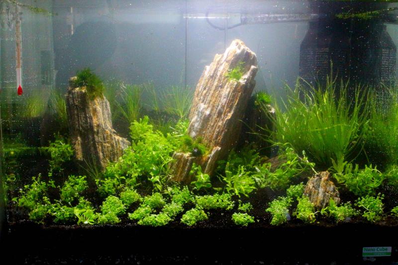 Διαστάσεις: 40x32x28 εκ Λίτρα: 30l Χρόνος λειτουργίας: 2 ώρες Τύπος και διάρκεια φωτισμού: Nano power led 5watt 6500kelvin 500 lumen 6 ώρες για αρχή, 8 αργότερα. Co2 και τρόπος διάχυσης: Excell (προς το παρόν) Λίπανση: Υπό σκέψη Υπόστρωμα: Tropica Aqua soil powder + χαλαζιακό χαλίκι μικρής κοκκομετρίας. Φίλτρανση: Nano corner filter 150l/h Θερμοκρασία: 23-24 C pΗ: - GΗ: - KΗ: - Λίστα φυτών: Bacopa australis x2, Vescicularia ferrieri x1, Micranthemum sp monte carlo x2, Hemianthus callitrihoides cuba x 2, Blyxa japonica x1, Eleocharis acicularis x2, Posgostemon helferi x1. Λίστα ψαριών και ασπόνδυλων : Σε 2 εβδομάδες 6 γαρίδες (3 amano, 3 red cherry) 1-2 σαλιγκάρια (άγνωστο τι ακόμα) Σε 1 μήνα 7 danio, 3 ottos?? Ισως κάτι άλλο? Πάνω που ήμουν έτοιμος για να ξεκινήσω με 240 η 300 λίτρα κάνοντας τα σχέδια και την λίστα του εξοπλισμού, το αμάξι μου αποφάσισε να κάψει μηχανή οπότε bye μεγάλο ενυδρείο και hi καινούργια μηχανή. Επειδή όμως η κάψα για ενυδρείο παρέμεινε, αρκέστηκα σε ένα μικρό ενυδρειάκι για αρχή ώστε να ξεγελαστώ μέχρι να έρθει η ώρα του μεγάλου και να κάνω τα πειράματά μου μέχρι εκείνη την ώρα. Σύνολο εξοπλισμού μαζί με τα φυτάκια 150 ευρώ. Θα προσπαθήσω με τον υπάρχοντα φωτισμό και χωρίς co2, συμπληρώνοντας κανένα λίπασμα (προς το παρόν δεν έχω ιδέα αλλά διαβάζω) και excell σε χ3 δόση από αυτή που συνιστά η Seachem. Το ΠΣΚ θα προμηθευτώ και τα υγρά τεστάκια ώστε να αρχίσω τις μετρήσεις και βλέπουμε πως θα πάει. Ισως αργότερα να μπει περισσότερος φωτισμός, mini co2 σύστημα και ένα μικρό εξωτερικό φίλτρο, αλλά προς το παρόν προτιμώ να προσπαθήσω όπως είναι τώρα κάνοντας οικονομίες για το κυρίως ενυδρείο. Τα φυτά που διάλεξα είναι εν γνώση μου μία μίξη εύκολων και δυσκολότερων φυτών αλλά θέλω να τα προσπαθήσω έτσι και αλλιώς. Πάντα μπορώ να κάνω αλλαγές στη σύνθεση δοκιμάζοντας και άλλα είδη. Αυτά. Ο θεός βοηθός. Οποιος δεν βαριέται ας κάνει οποιοδήποτε σχόλιο. Τα πάντα δεκτά και σεβαστά. Οι φωτογραφίες τραβήχτηκαν 15 λεπτά μετά το πλήρες γέμισμα. |