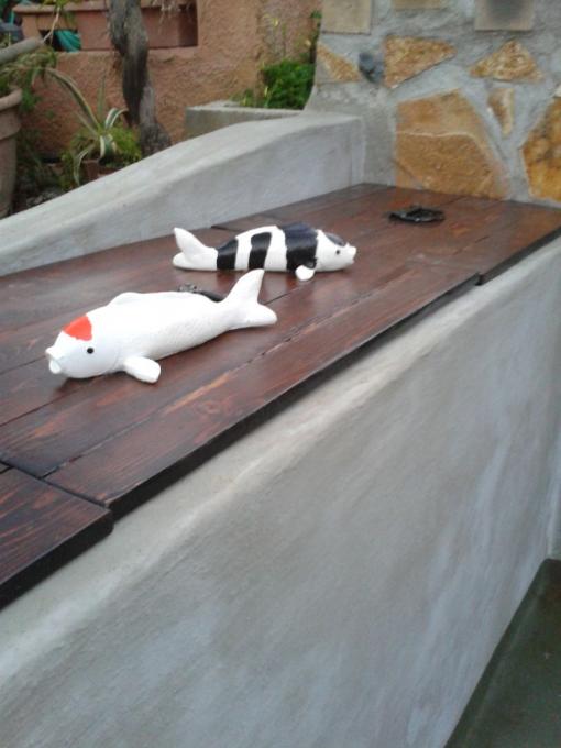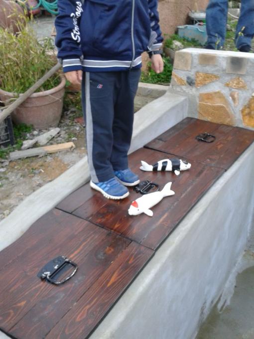 και συνεχιζουμε .αφου αδειασαμε απο τα νερα των βροχων τοποθετησα τα σποτακια ,και επρεπε να φτιαξω και γεφυρακι.λεω πως επρεπε γιατι εκτος τον διακοσμητικο του ρολο εχει μεγαλο χρηστικο μιας και με τισ λιμνες χωριστηκε ο κηπος σχεδον στη μεση.για τα πατηματα στο γεφυρακι αγορασα μαδερια,τα εκοψα,τα ετριψα και τα περασα συντηριτικο ξυλου και λουστρο. και παιδια παρακαλω πολυ αν σας ερθει καμια ιδεα η εχετε καποια αποψη για το σκιμερ μου παρακαλω βοηθηστε!!!