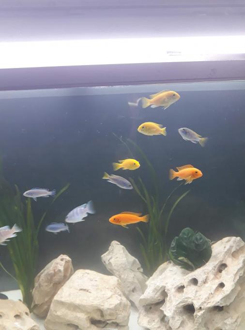Το ενυδρείο σου έχει καλές διαστάσεις για Malawi και οι μετρήσεις σου είναι καλές(φτάνει να είναι με υγρά τεστ για να είναι αξιόπιστες). Οι πέτρες είναι λίγο "αφύσικα" στημένες (θα προτιμούσα λίγο πιο "άναρχα") και θα ήθελα περισσότερες για να δημιουργούν όσο το δυνατό περισσότερες κρυψώνες. Η ψαροσύνθεση θέλει διορθώσεις κατά τη γνώμη μου. Τα κιτρινόμαυρα με οριζόντιο ριγέ είναι Melanochromis auratus και όταν ενηλικιωθούν θα γίνουν ο εφιάλτης των υπολοίπων. Αυτά με το γαλαζωπό σώμα και την κίτρινη ουρά είναι Pseudotropheus sp. "acei" και είναι καλή επιλογή γιατί είναι σχετικά ήρεμα και κολυμπούν στα ανοιχτά (δεν ξεχωρίζει εύκολα το φύλο και πρέπει να βάλεις 5/6+ ώστε να βγει χαρέμι). Για τα υπόλοιπα δεν έχω καθαρή εικόνα (τα πορτοκαλί μάλλον είναι Metriaclima estherae). Βάλε κοντινότερες φωτο και θα ήθελα να γράψεις πόσα έχεις από το κάθε είδος. |